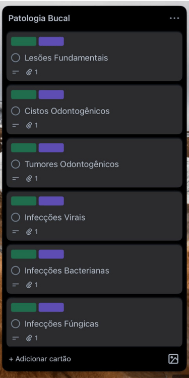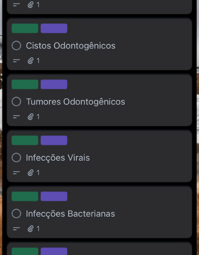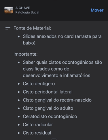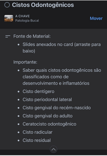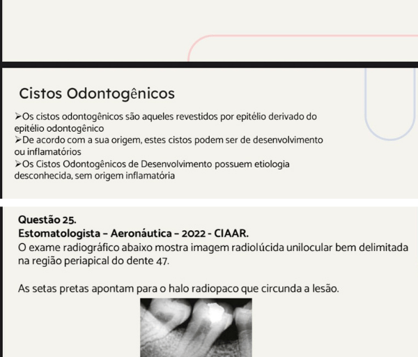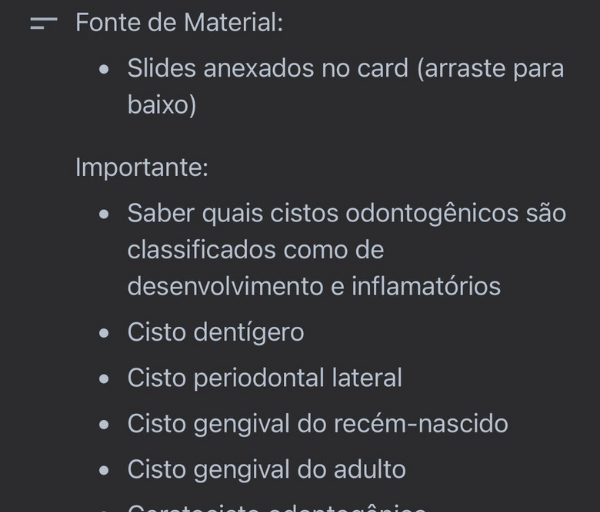 2.Cada tema vem dividido com os pontos mais importantes (exemplo da parte de Cistos Odontogênicos):